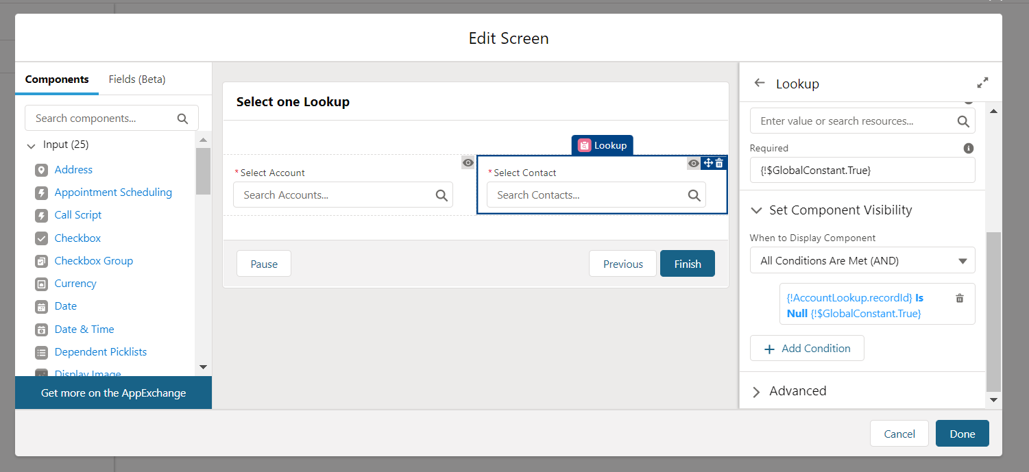 Suppose we have a use case where we need to select exactly one lookup: either account or contact in a screen flow. We can make use of component visibility option to hide one lookup when the other is selected. Also we can use required input attribute to ensure user needs to select one lookup.